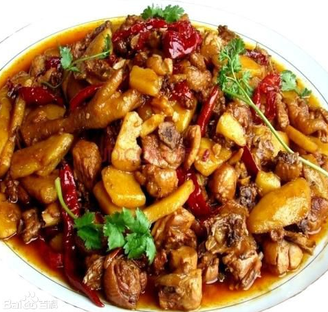 新疆大盘鸡又名为沙湾大盘鸡,是新疆名菜,起源于20世纪80年代后期,主要用料为鸡块和土豆块、四川粉皮