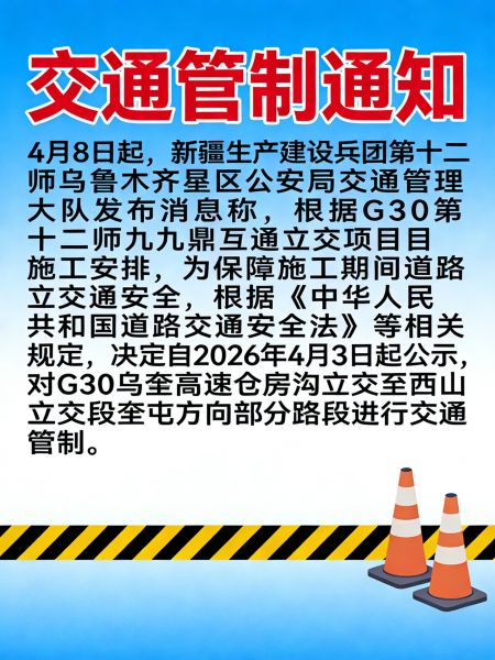 4月8日,新疆生产建设兵团第十二师乌鲁木齐垦区公安局交通管理大队发布消息称,根据G30第十二师九鼎互