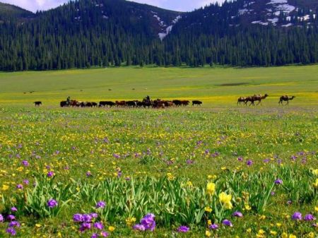 喀拉峻大草原位于新疆伊犁河谷的特克斯县境内,是西天山向伊犁河谷的过渡地带,这里降水丰富,气候凉爽,土质肥厚,十分适宜牧草的生长,生长有上百种优质牧草,并于2013年被正式列入联合国教科文组织世界遗产名录。喀拉峻大草原属典型的高山五花草甸天然大草原,海拔在1305-3957米之间,东西长89公里、南北
